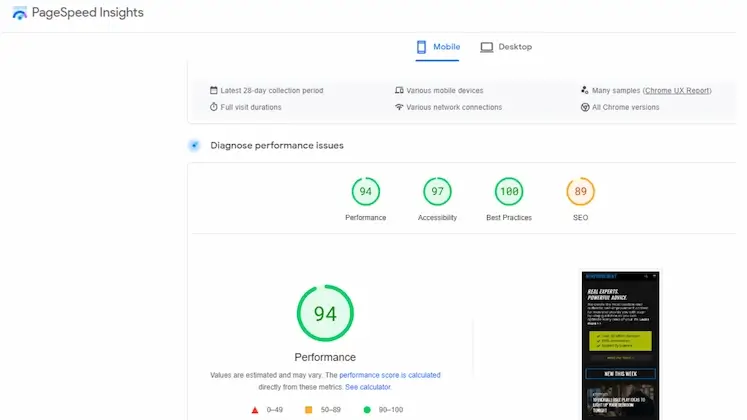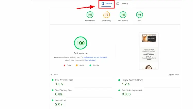 Garantia de 75+ no PageSpeed Insights em dispositivos móveis